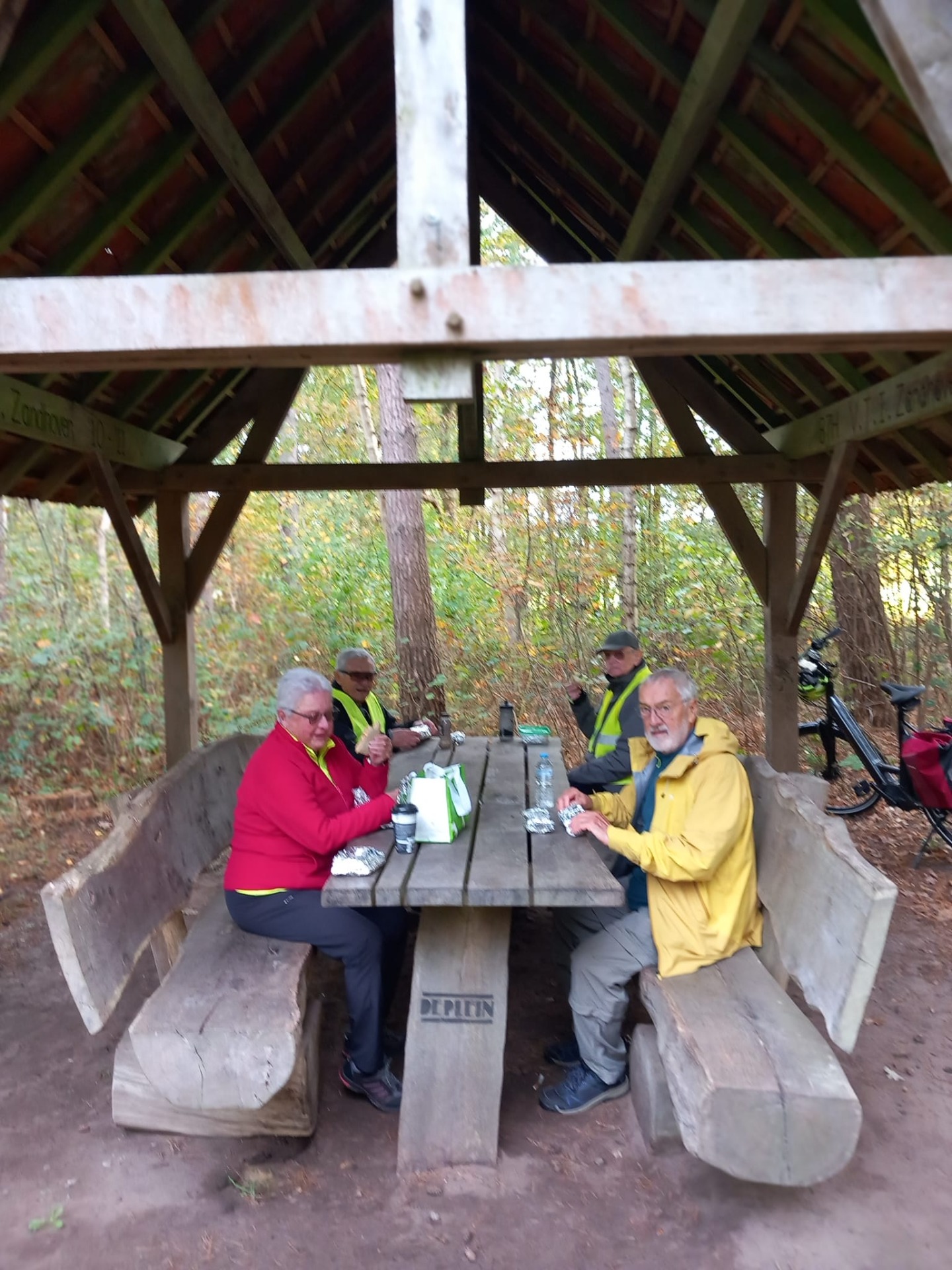 Het weer was grijs en voelde herfstachtig aan - wat kil en vochtig. Na de verplichte koffie op weg richting Zoersel. Al gauw werden we geconfronteerd met de prachtige herfstkleuren. Door het Zoerselbos op het mooie nieuw aangelegd fietspad was genieten van het kleurenpalet, spijtig ontbrak het zonnetje. Maar wat later op weg naar Halle was de zon er wel. Even naar Halledorp voor een café te zoeken voor onze bokes te nuttigen, doch vergeet het maar. Alles toe, in de "voorkempen" kan het nog rustig zijn ! Dan maar trappen tot we uiteindelijk beloond werden met tafel en banken en een dak boven ons hoofd. Beter kon niet bij gebrek van horeca.