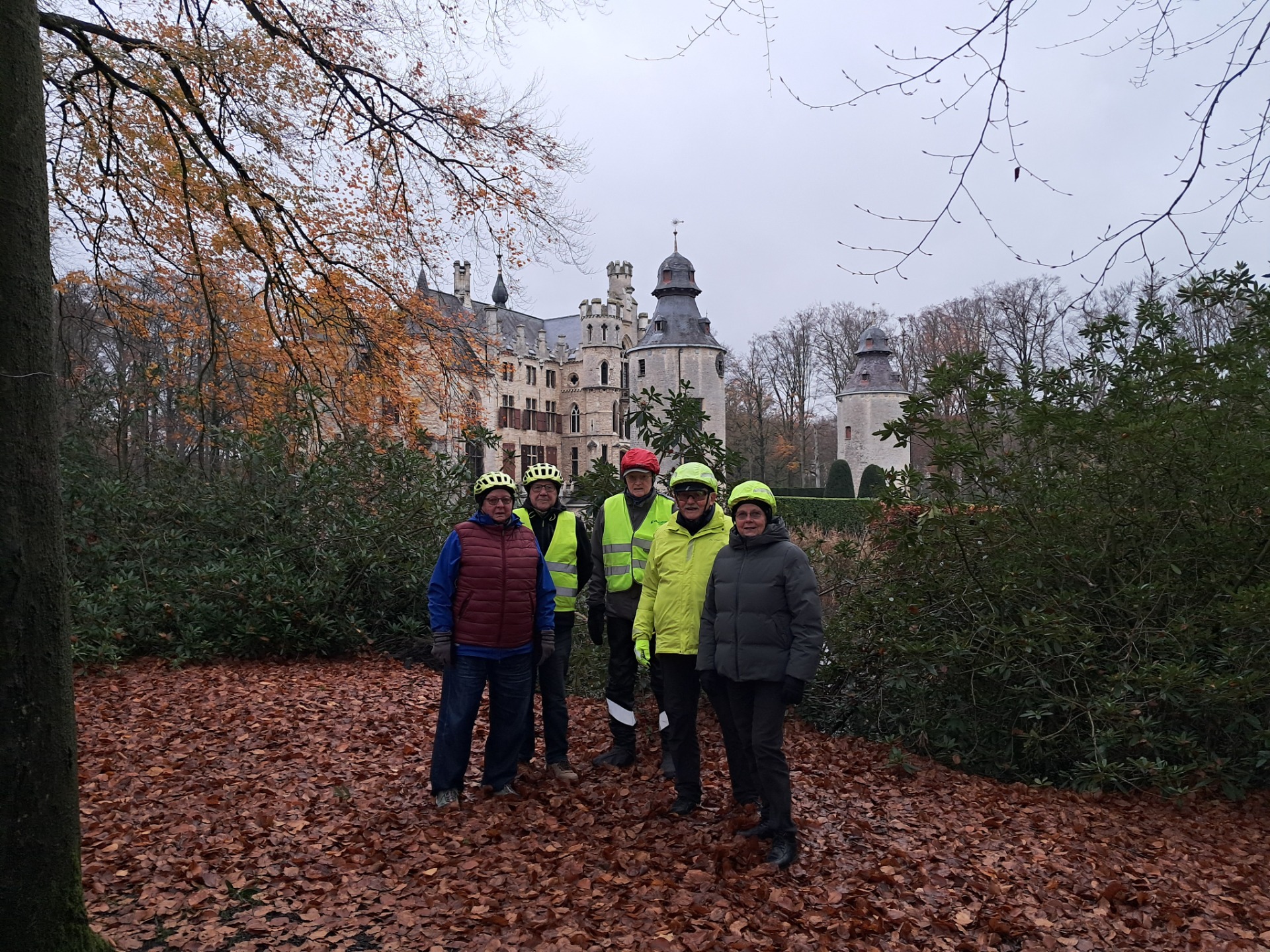 De start was wel koud – 10° minder dan gisteren. Gelukkig kon de zon ons opwarmen. Op weg met 6 personen voor een hele mooie tocht vol verrassingen. Na het oversteken van een drukke baan kwamen we in een donkere dreef met statige bomen. Die leidde ons naar het grote domein "Metsteren"