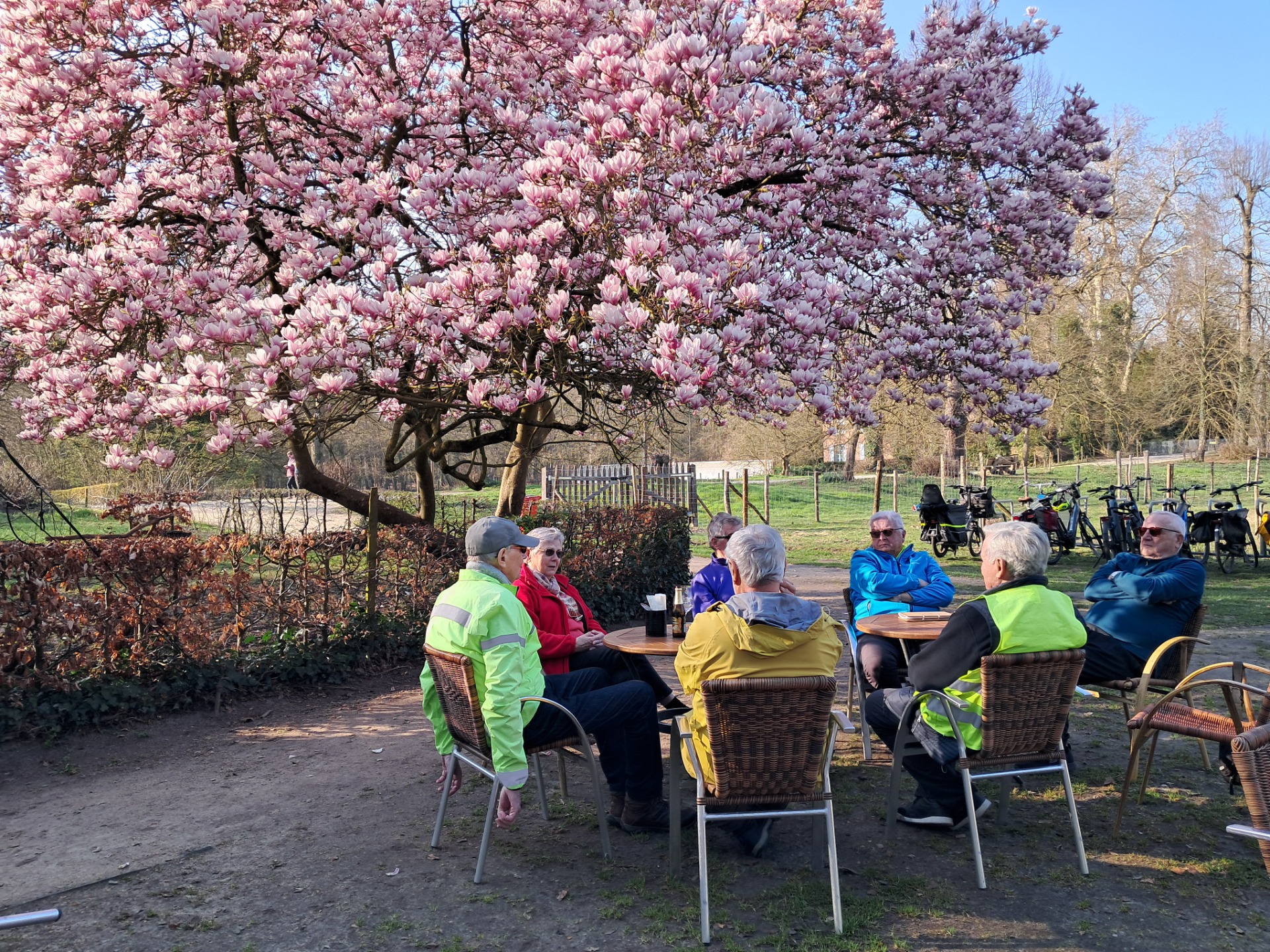 Hier hielden we een stop in Domein Roosendael. Onder de bloeiende magnolia was het aangenaam verpozen. Nu nog een tiental kilometers. Via de oversteek aan de blauwe bruggen waren we op weg om aan de wagens uit te komen.