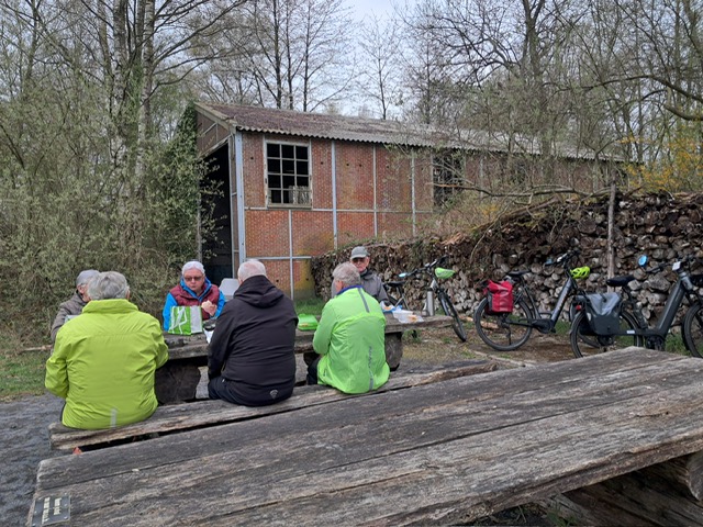 Met 7 vertrekkers trotseerden we de kille wind en dreigende wolken.Via wat zandwegen(verhard) op weg naar Achterbos en Millegem. Intussen was het ook uitzien naar enig horeca voor ons "bokes" , maar nergens iets open te vinden. Dan maar in de pure natuur op een bank met tafel.