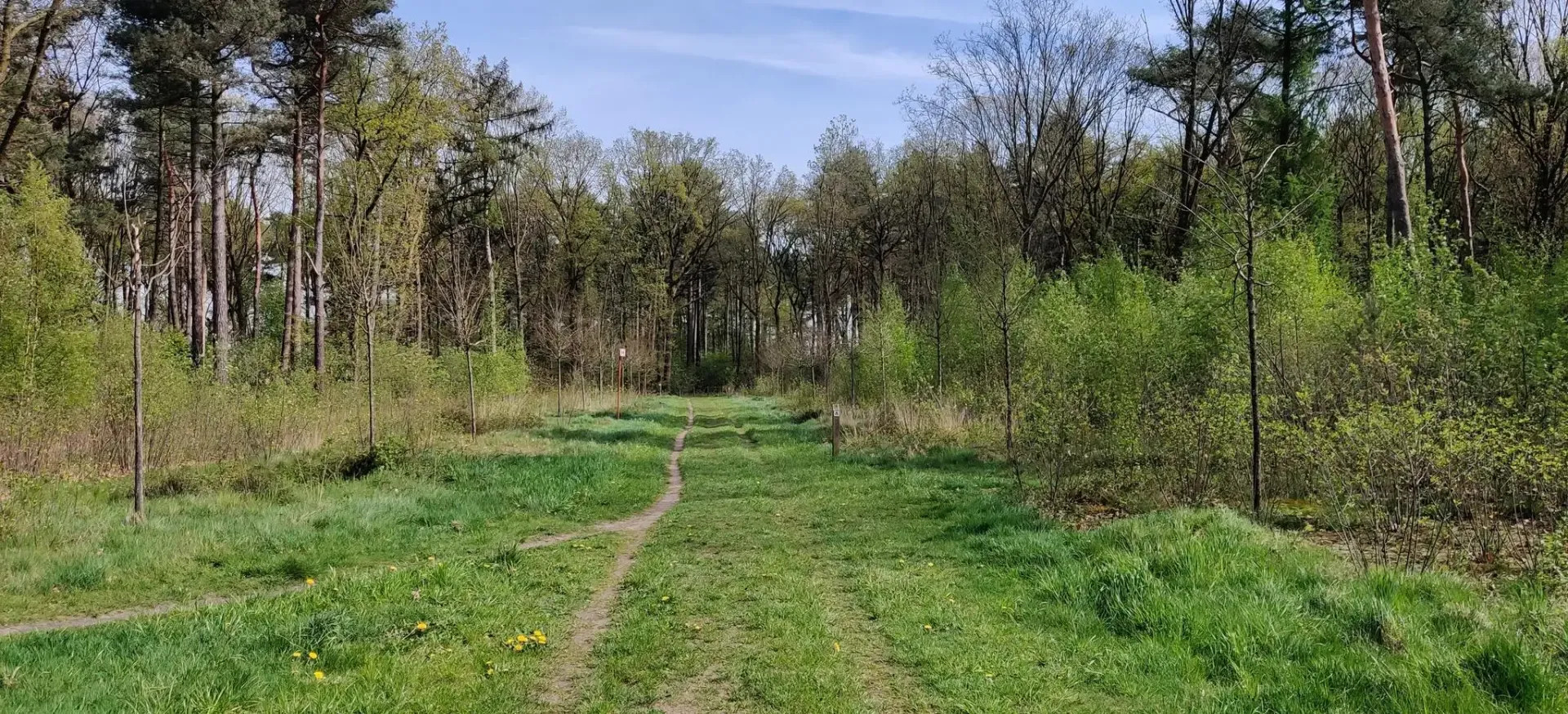 Met zonneschijn gaan we op stap, al direct vanop de parking op zanderige paadjes en nadien door het bos. Twee pitsen er een kilometertje af, ook via mooie wegen, met afsluitpoortjes.